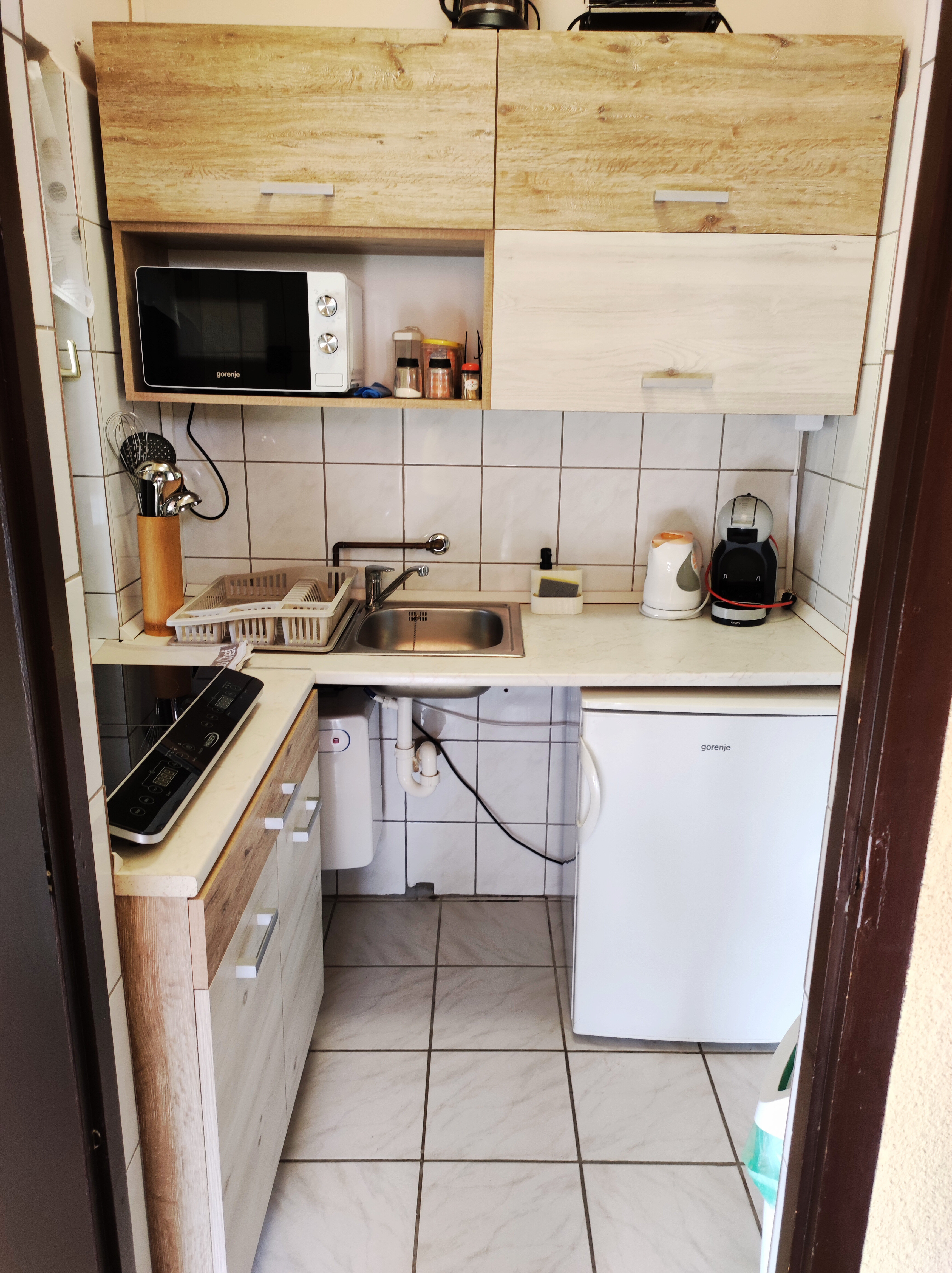 A földszinten elhelyezkedő nappaliban egy ágyazható kanapé található, valamint fürdőszoba zuhanyzóval, külön helyiségben toalett. A teraszról külön bejáratú, jól felszerelt főzőkonyha (elektromos főzőlap, mikrohullámú sütő, kenyérpirító, kávé- és teafőző, vízforraló, melegszendvics-sütő, edények) nyílik. A 2021-ben kibővített terasz tetőszerkezete alatt helyezkedik el a hat személyes étkezőasztal.